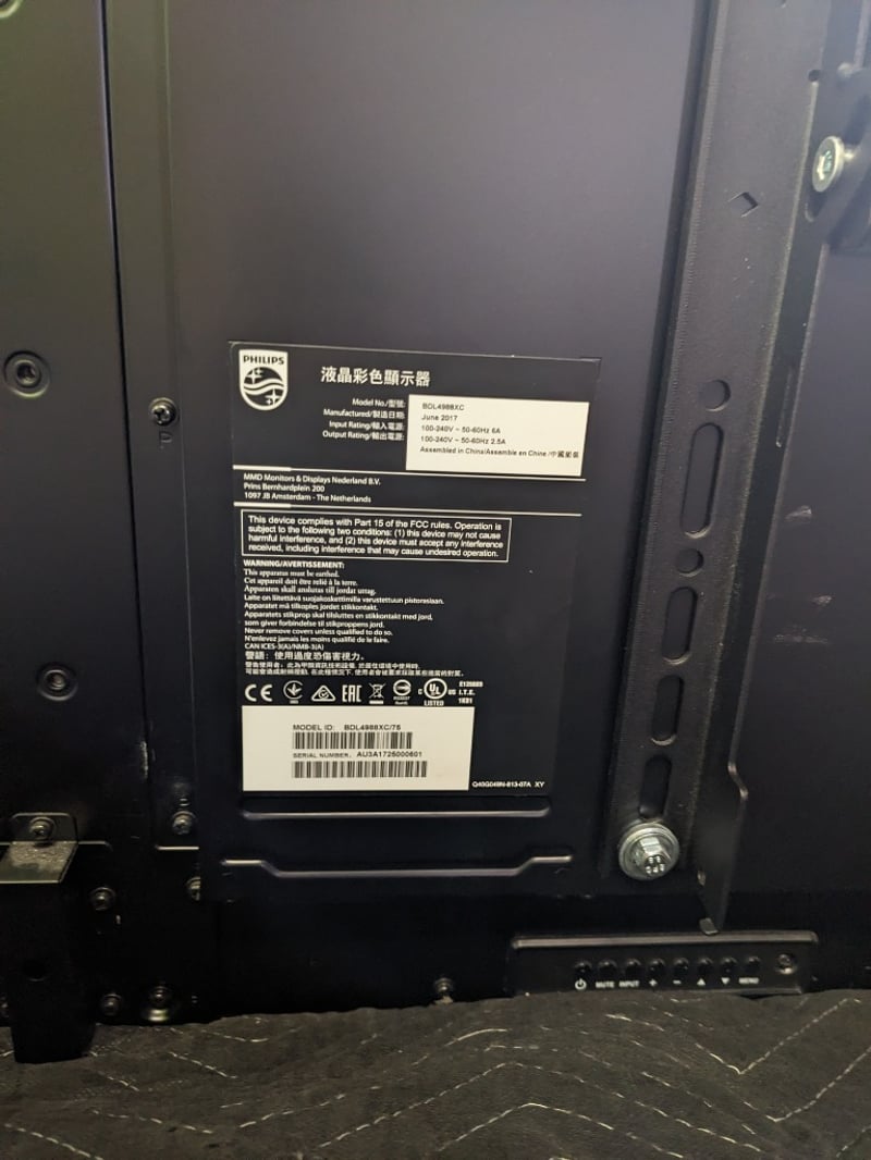 Philips screen, power cable included and bracket Model number: BDL4988XC/75Dims: H:60cm x W: 120cm x D: 7cmSold as lotNote: Untasted and signs of wear and tear