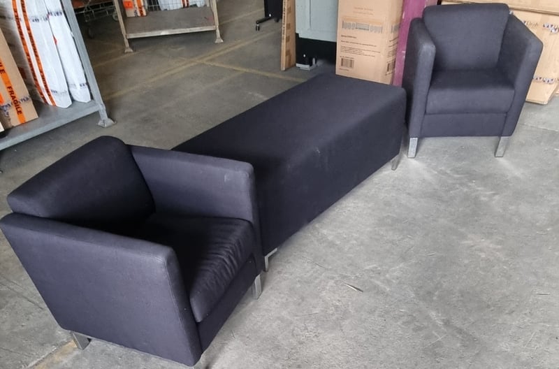 Office furniture, upholstered black, 2 x 1 single arm chairs and 1 x long ottoman with metal legs. Dims: (chairs) 60 x 100 x 100cm, (ottoman) 120 x 80 x 90cm Sold as lot Note: may have wear and tear.
