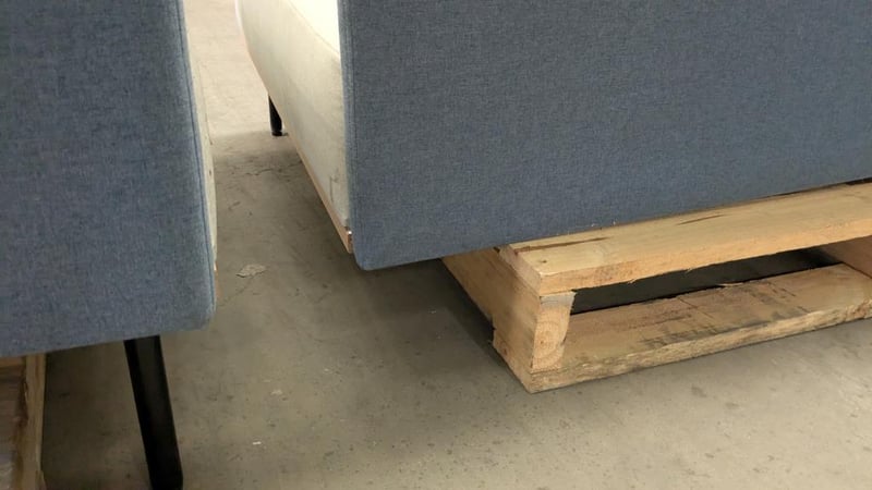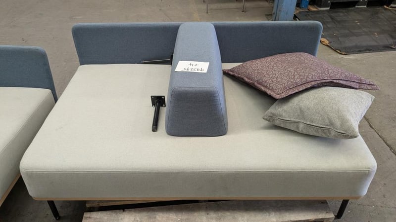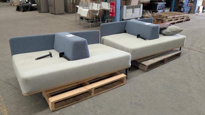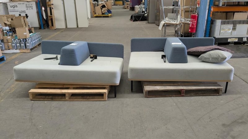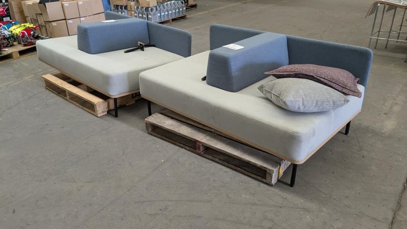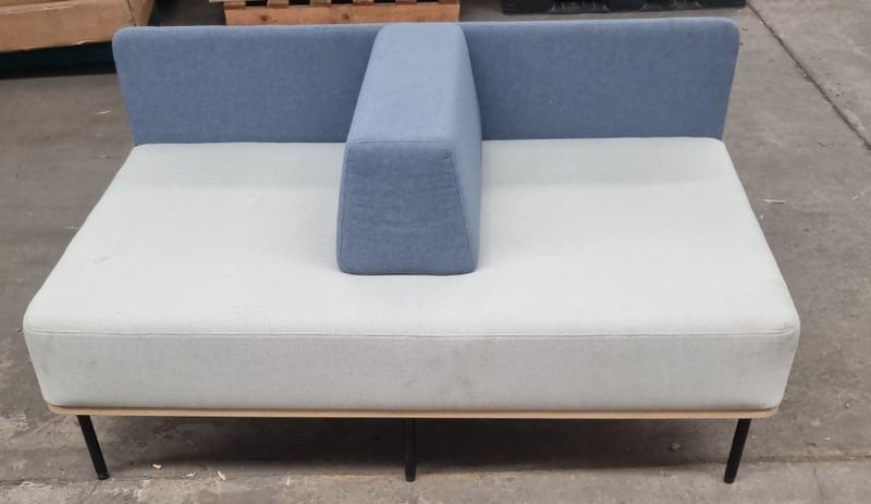 Office lounge, 2 seater with arm rest, upholstered.Qty x 2 Dims : 156 x 98 x 80 individual Note: Damage to feet, included, Signs of wear and tear