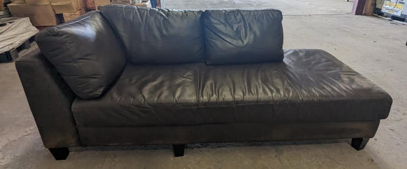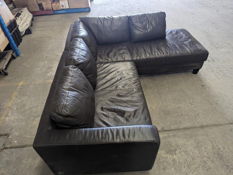 5 seater Spacious Dark Brown Leather Sectional Sofa – L-Shaped Comfort. Timber Base, Couch with chaise DIMENSIONS: 340cm X 60cm X 90Note: Signs of wear, Dust layer