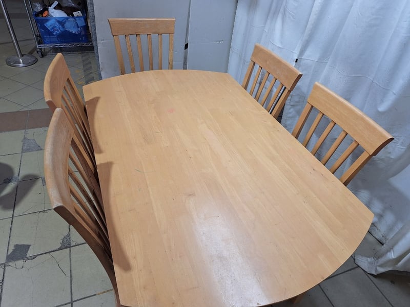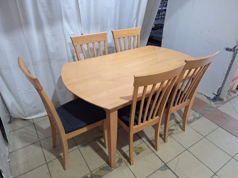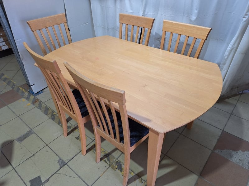 5 Seater Dining Table, Cushioned Seats, Timber Style, Natural FinishDimensions Chairs H:98cm W:40cm D:47cmDimensions Table H:74cm W:150cm D:90cmSOLD AS LOT