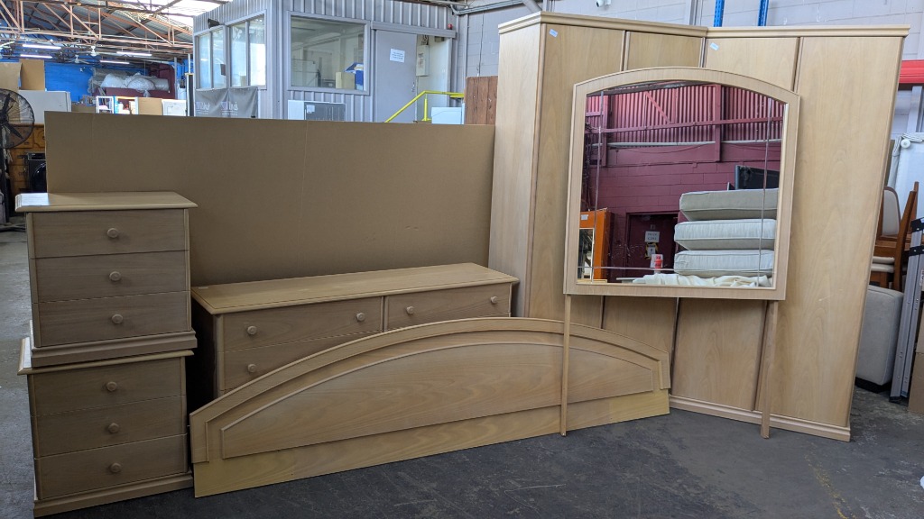 Bedroom suite, including wardrobes side table, bed head and dresser with mirror Sold as lot