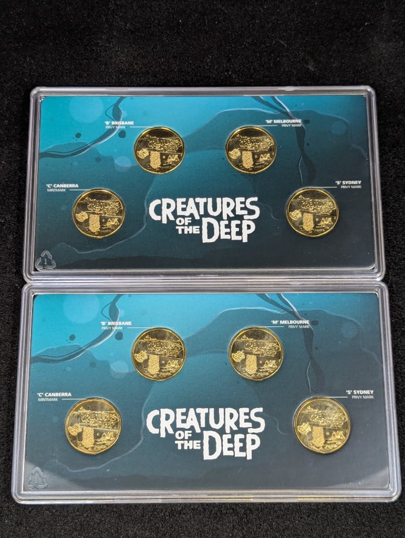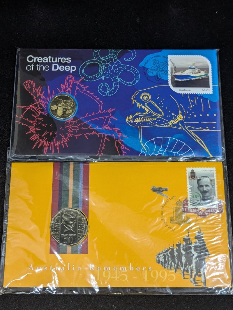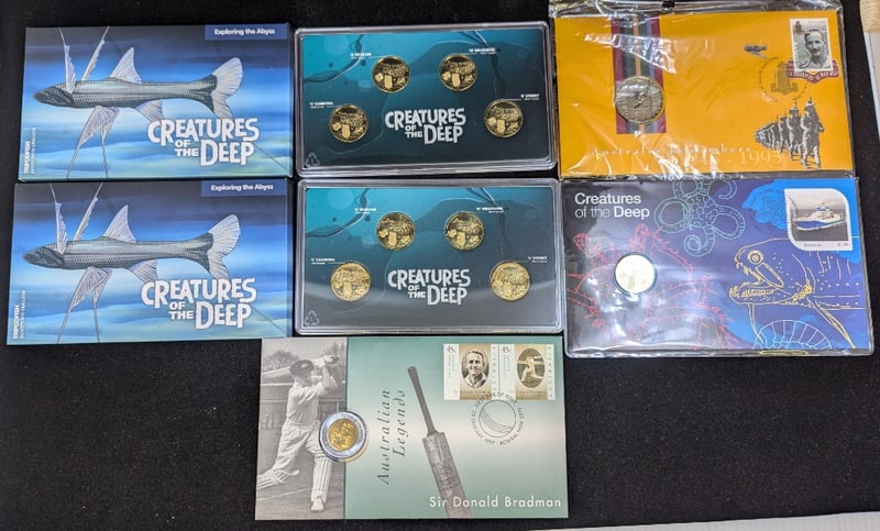 COLLECTION OF AUSTRALIAN COMMEMORATIVE COINSIncludes Two 2023 Creatures Of The Deep Mintmark Tripodfish Four Coin Sets, 2023 Creatures Oft He Deep One Dollar Coin And Cover Stamp, 1995 Australia Remembers - Weary Dunlop Fifty Cent Coin And Cover Stamp, 1997 Sir Donald Bradman Fit Dollar Coin And Cover StampCondition: Unc584872+81