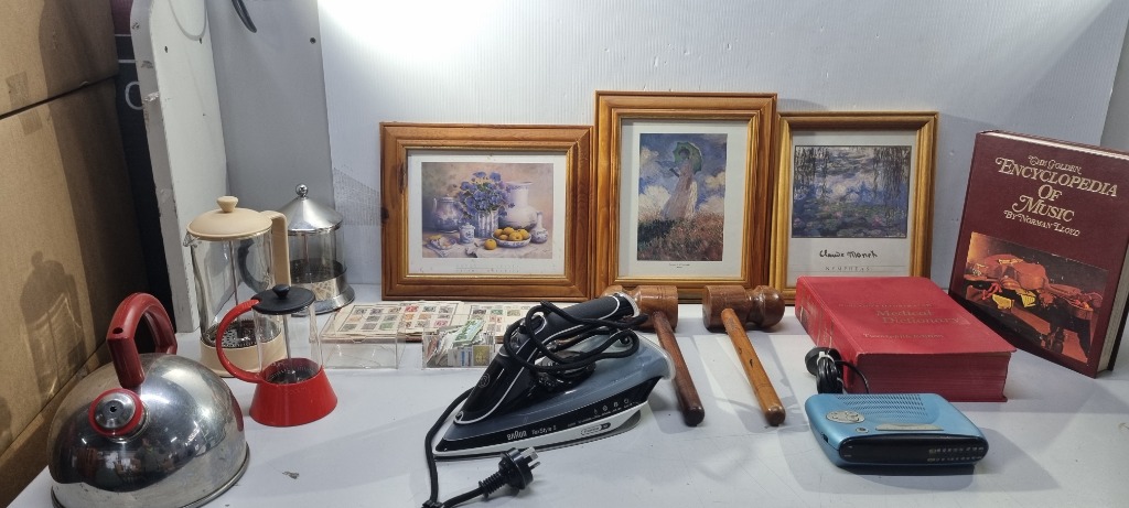 Homewares, assorted homewares including Iron, Medical Dictionary, stamps and more Sold as lot
