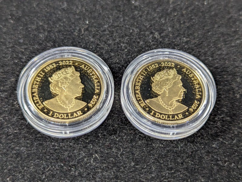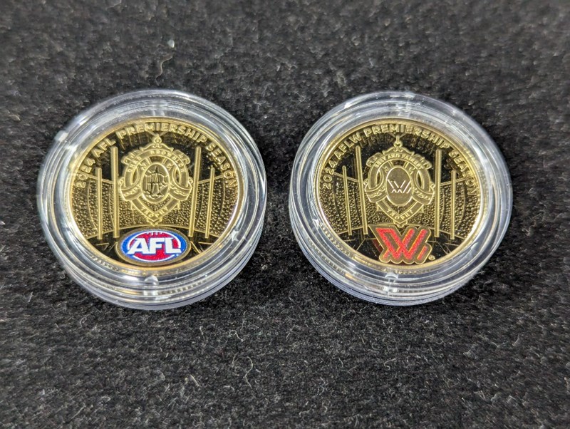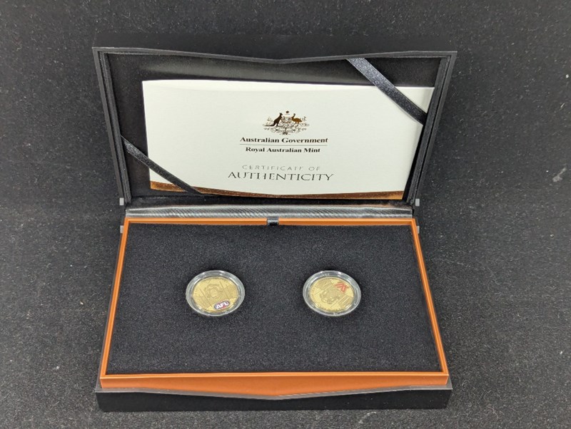 ROYAL AUSTRALIAN MINT AFL FOOTBALL LEAGUE TWO $1 COLOURED COIN SET. Condition: Proof 151160+5