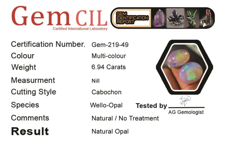 6.94 CARATS NATURAL CERTIFIED OPAL 6.94 Carats Natural Certified OpalStone = Natural OpalWeight = 6.94 Carats Cut = Fancy Colour = Play Of Various ColoursCut = Cabochon Treatment = Natural, No TreatmentNote = Picture Taken Under Light Condition: Good645399+49