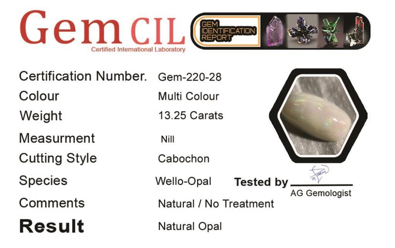 13.25 CARATS NATURAL CERTIFIED OPAL 13.25 Carats Natural Certified OpalStone = Natural OpalWeight = 13.25 Carats Cut = Fancy Colour = Multi ColourCut = Cabochon Treatment = Natural, No TreatmentNote = Gem Cil, Certified Pic Taken Under Light Condition: Good 0+78