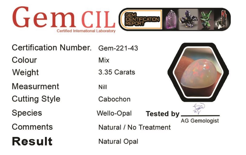 3.35 CARATS NATURAL CERTIFIED OPAL 3.35 Carats Natural Certified OpalStone = Natural OpalWeight = 3.35 Carats Cut = Fancy Colour = Play Of Various ColoursCut = Cabochon Treatment = Natural, No TreatmentNote = Picture Taken Under Light Condition: Good 0+143