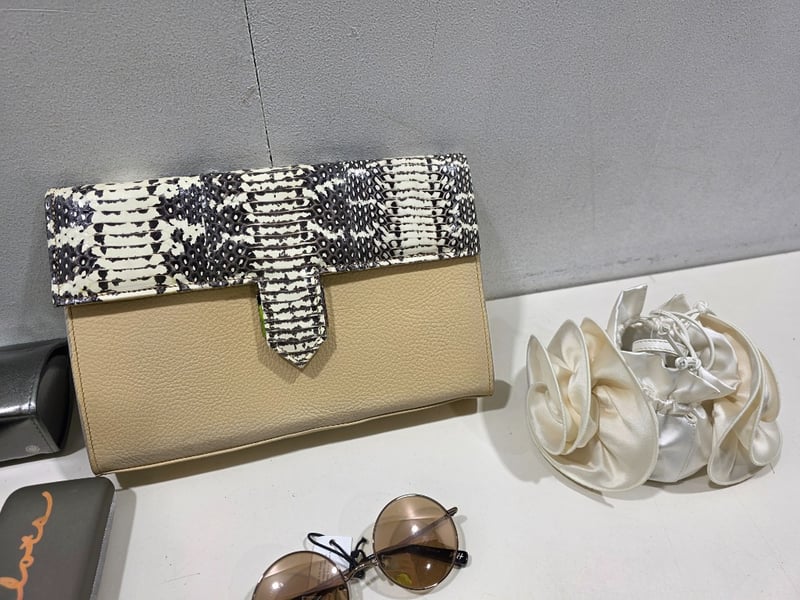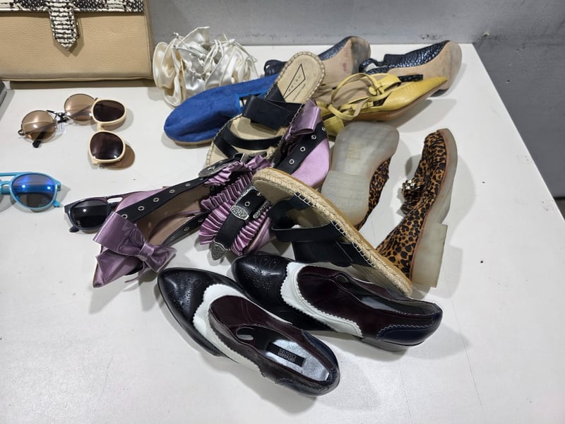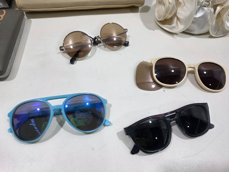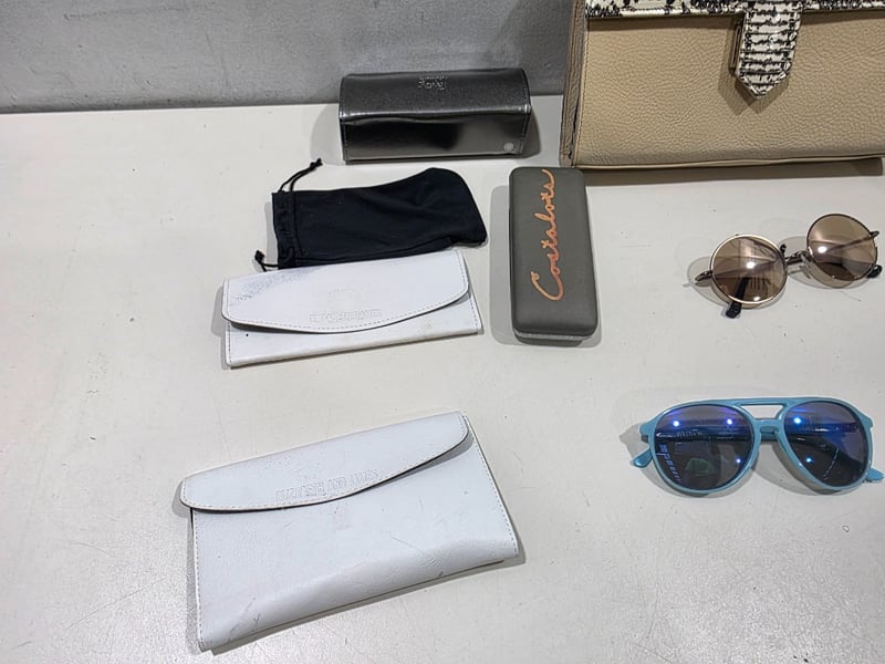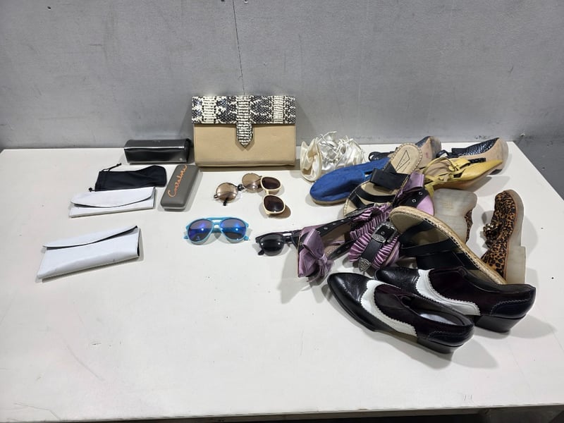 Assorted Lot of Accessories including Sunglasses, sunglasses cases, Amanda kendell clutch, pearl clutch, various shoes