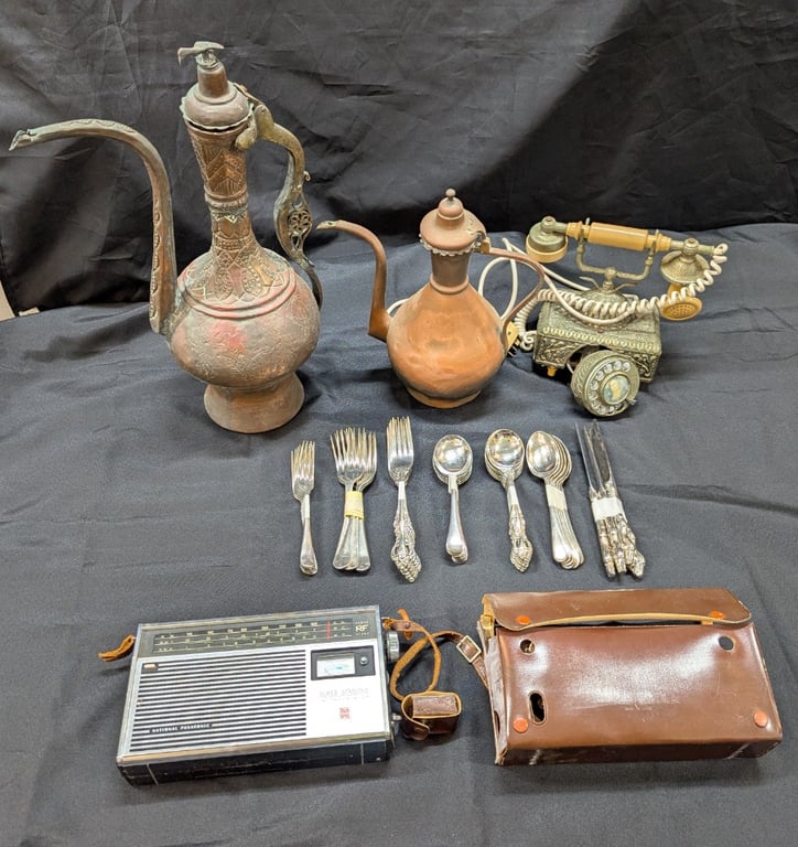 Includes Sets Of Cutlery, Tin Ewer, Rotary Phone, Copper Tea Pot, And National Panasonic Transistor