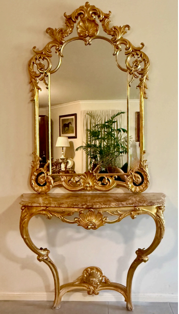 FRENCH C 1840 ROCOCO STYLE GILT MIRROR AND CONSOLE TABLE. THIS GENUINE 19TH CENTURY MIRROR HAS ALL THE FLAMBOYANCE AND EXUBERANCE THAT CHARACTERISES THE FRENCH ROCOCO STYLE. THE MIRROR AND CONSOLE TABLE PRESENTS IN EXCELLENT CONDITION, WITH BOTH ITS ORIGINAL MIRROR AND MARBLE TOP AND ITS GILDING IN GOOD ORIGINAL CONDITION BOTH BRIGHT AND SHOWING NO ISSUES.Condition: Good - Refer To Images587681+3