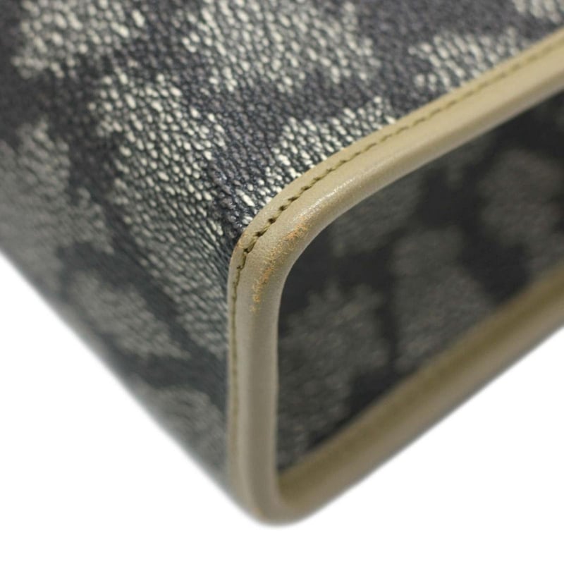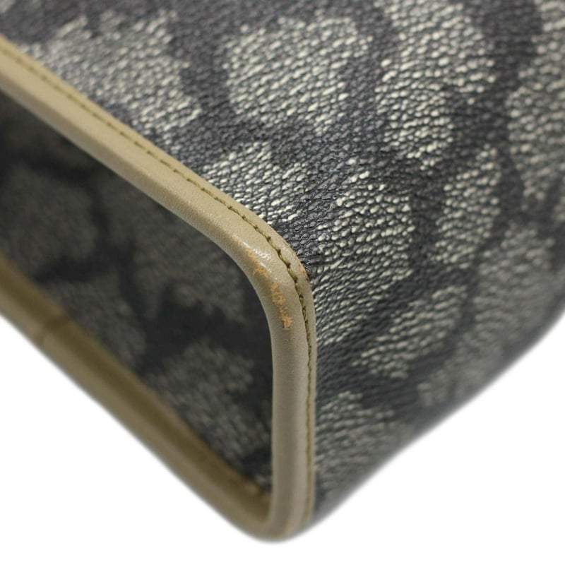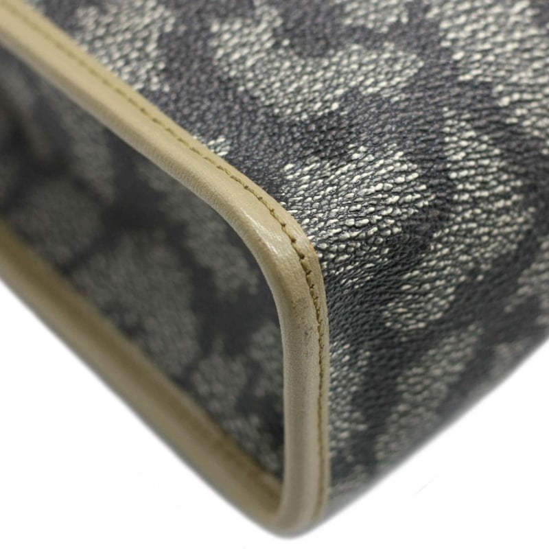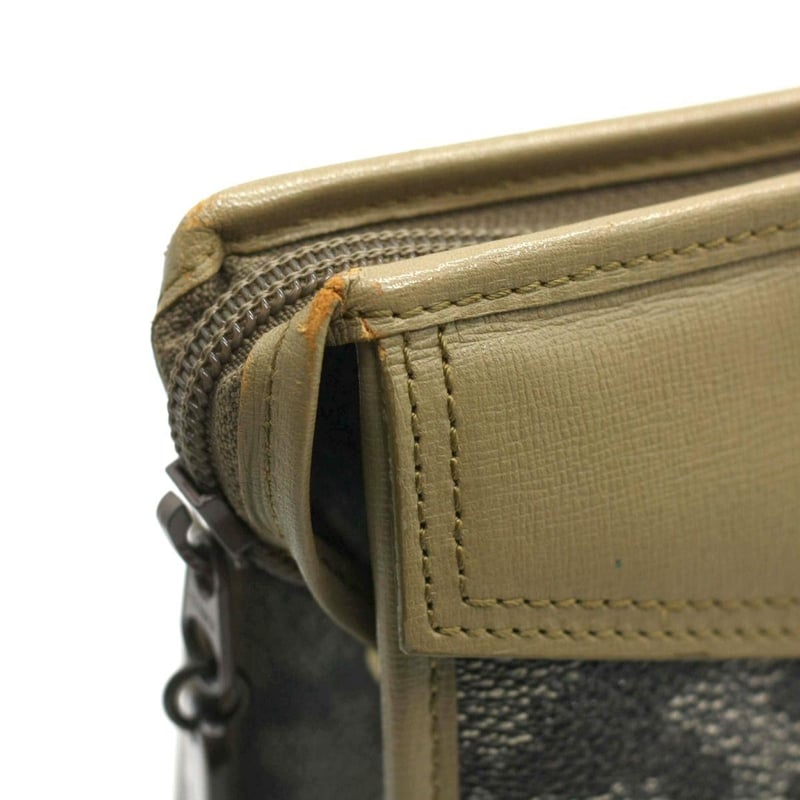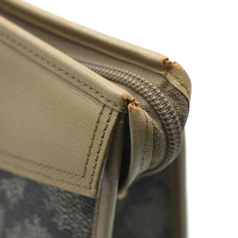 Coated canvas and leather trim with gold-tone hardware and top zip closure.