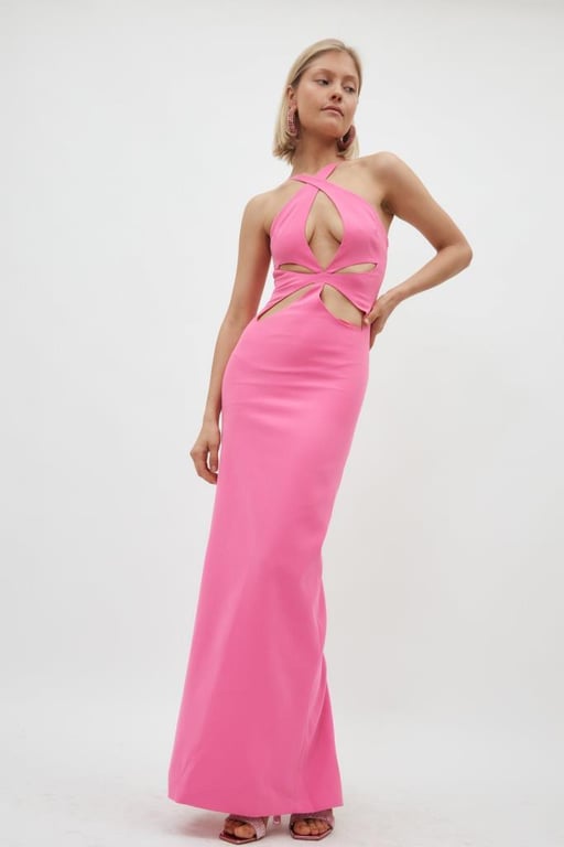 RRP $2690 Size 2 Monot Halterneck Pink Petal Cut Out Dress Halterneck maxi dress with sculptural petal cut outs at waist 100% Polyester Made in USA (New York) Monot