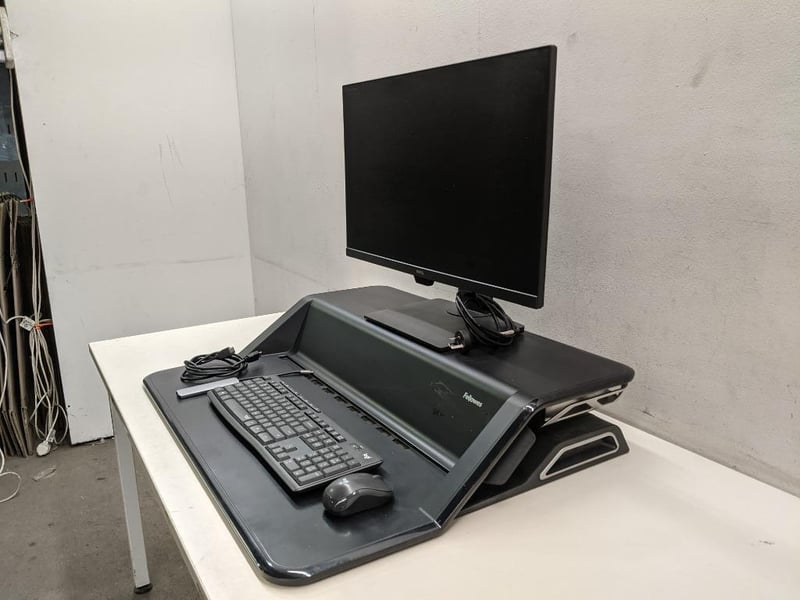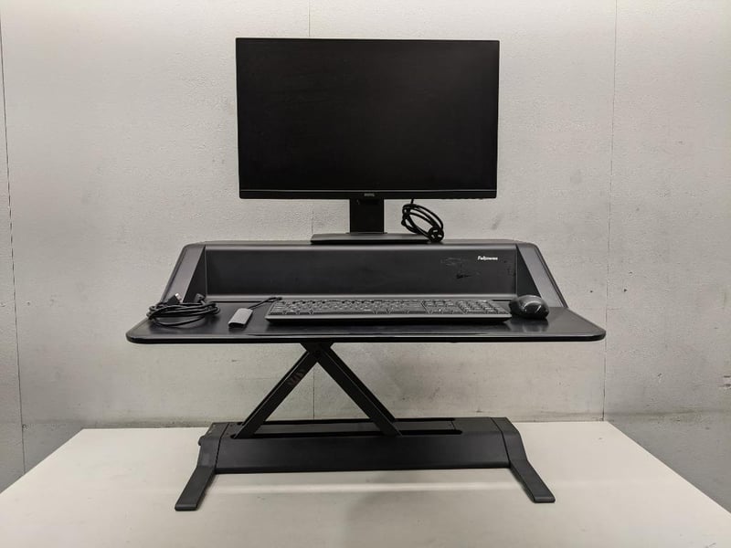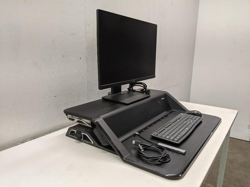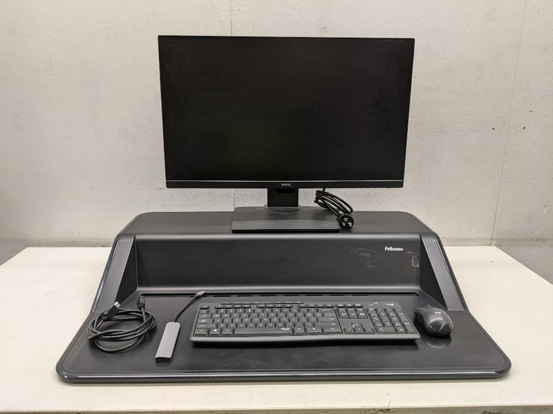 Office Station Setup - Items include:- Sit Stand Workstations - Fellowes Lotus, black, 430mm max. height, 831mm, Dims: 15/55 x 80 x 60cm- Computer Monitor - Benq GW2780-T, 27" IPS FHD, DOM: 10/21, S/N: ETGAM0716501Q, Power cord included- Keyboard - Logi K295, wireless- Mouse - Logi M220, wireless- Hub - Novoo NVHUBGY05PDNS, USB-C, HDMI cable includedNote: Minor signs of wear consistent with regular use. Units are untestedSold as lot, bid per each
