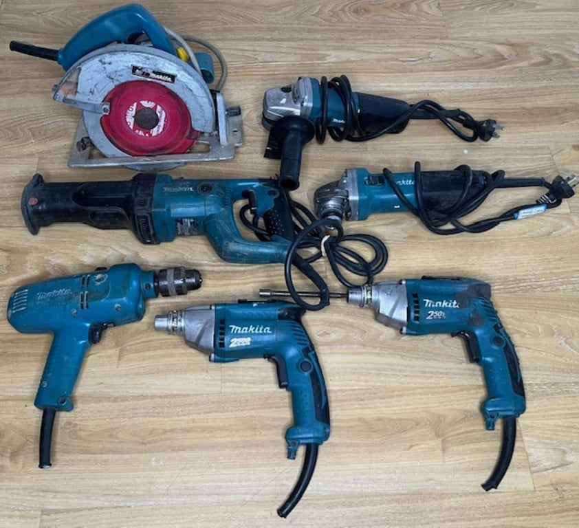 Makita power tools. 1 x 5007NB circular saw, 1 x JR3050T reciprocating saw, 1 x 9555HN angle grinder, 1 x 9556NB angle grinder, 1 x FS2300 drywall screwdriver with cord cut, 1 x FS2500 drywall screwdriver with cord cut, 1 x NHP1310 hammer drill with cord cut. 240V. Condition: Not working, untested, for parts or repair.