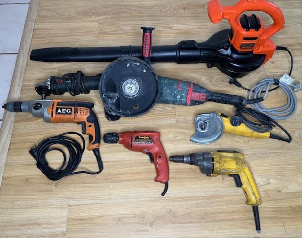 Assorted power tools. 1 x Black and Decker BEBLV230-XE blower, 1 x Metabo W850-125 angle grinder, 1 x AEG SB22-2 E hammer drill, 1 x DeWalt DWE4157-XE angle grinder, 1 x Metabo WE 24-180 MTV angle grinder, 1 x Trade Tools drill with cord cut, 1 x DeWalt drywall screwdriver with cord cut. 240V. Condition: Not working, untested, for parts or repair.