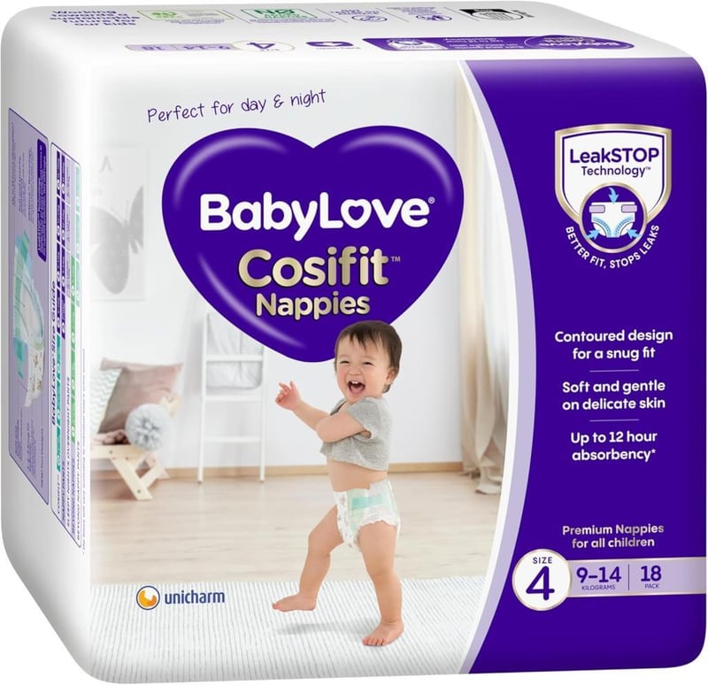 BABYLOVE COSIFIT NAPPIES SIZE 4 (9-14kg)- 72 Pieces (4 x 18 Pack)- Retail Return- Packets inside new condition- Original box