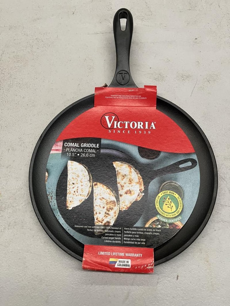 Victoria Cast Iron Comal Griddle, Round Comal Pan, Seasoned, 10.5 inch Black - RETAIL RETURN- UNUSED- ORIGINAL LABEL PACKAGING- AS NEW CONDITION- NO BOX