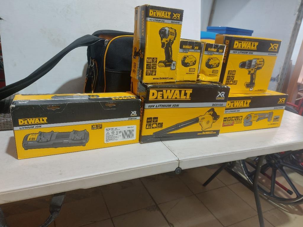 1 x DEWALT DCF85ON XR brushless 18V Lithium Ion compact impact Driver RRP$284.00, NEW factory sealed in box, 1 x DEWALT DCV100-XE 18V Li-Ion cordless blower, RRP$129.00, NEW factory sealed in box, 1 x DEWALT DCD996N brushless hammer drill driver, RRP$329.00, NEW factory sealed in box, 1 x DEWALT DCG416VSN XR brushless 18V angle grinder, RRP$499.00, NEW factory sealed in box, 1 x DEWALT DCB132 -XE flexvolt dual port charger, RRP$229.00, NEW factory sealed in box, 2 x DEWALT DCB184-XE, XR lithium ion 18V 5.0Ah batteries, RRP$229.00,NEW factory sealed in box,1 x DEWALT DWST1-81341, DWST521300 Duffle bag,NEW with tags with all the tools inside