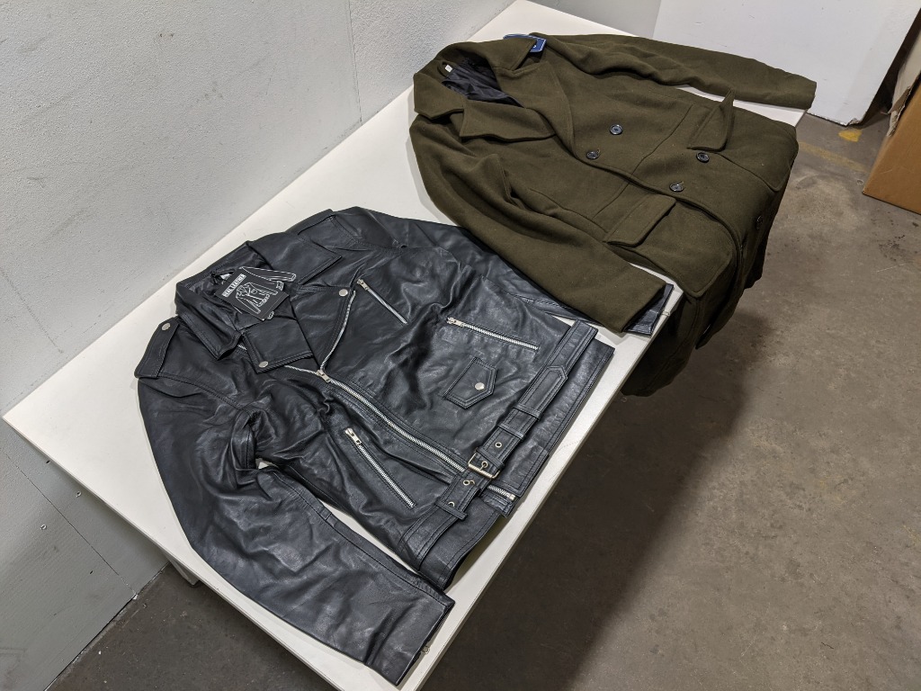 Men's Leather Jacket & Coat – Size XS - Belted Rider, Black - TWM Double Breasted Military Trench Coat, Green Sold as lot