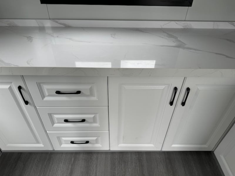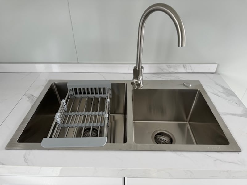 o Kitchen: Double bowl sink, stone benchtop, and modern cupboards.