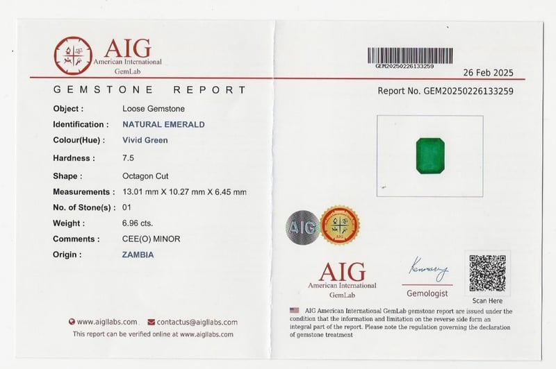 6.96ct in weight (13.01 x 10.27 x 6.45 mm) and Vivid Green in colour as per AIG report number GEM20250226133259. Stone has indications of minor clarity enhancement