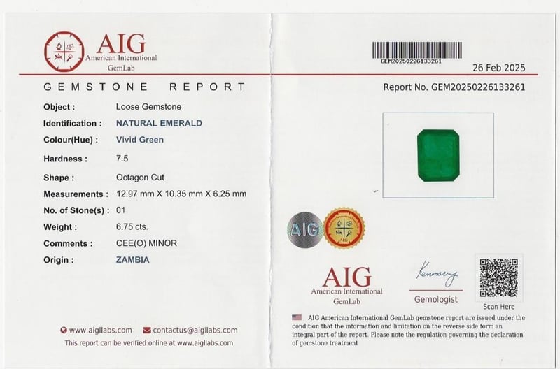 6.75ct in weight (12.97 x 10.35 x 6.25 mm) and Vivid Green in colour as AIG Report number GEM20250226133261. Stone has indications of minor clarity enhancement