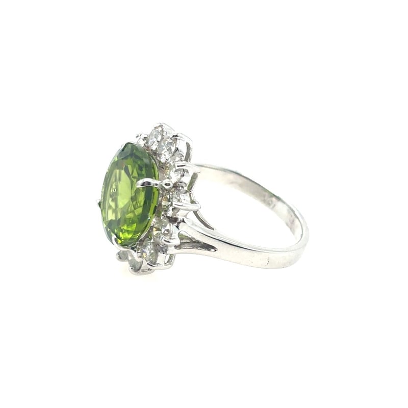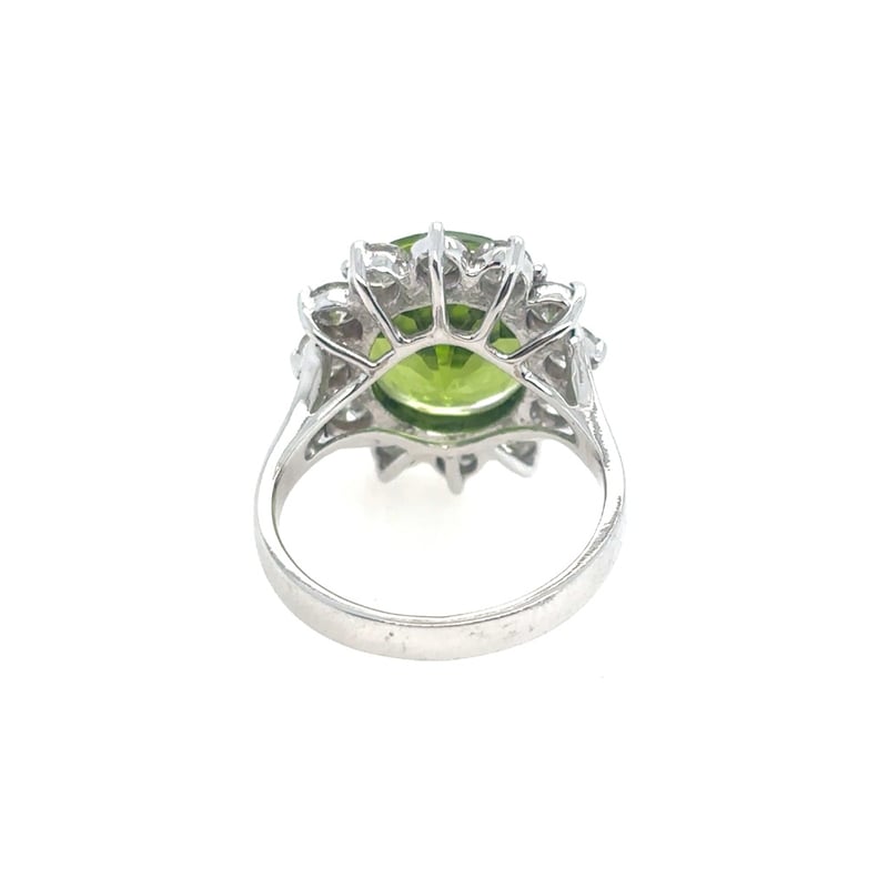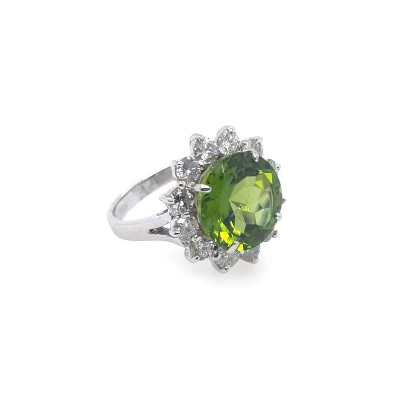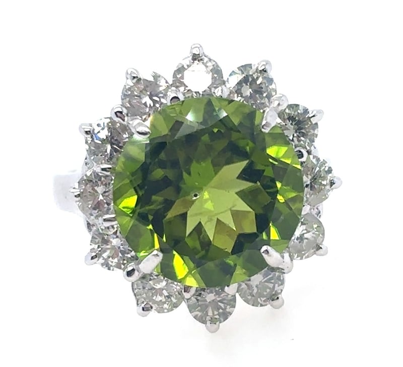 Featuring A Round Cut Peridot, Claw Set, 7.45Ct In Weight (12.2 X 7.4 Mm), And Green In Colour. 12 Round Brilliant Cut Diamonds, Set Around Centre Stone, 2.10Ct In Total Combined Weight, Si In Clarity And G In Colour. Finger Size N