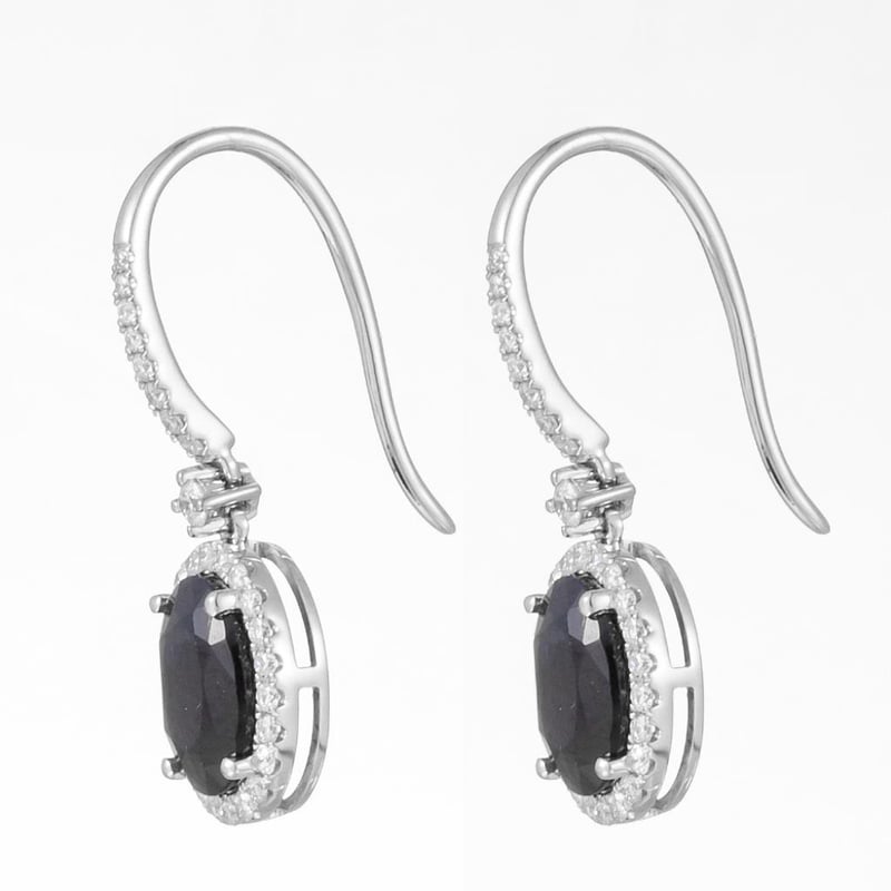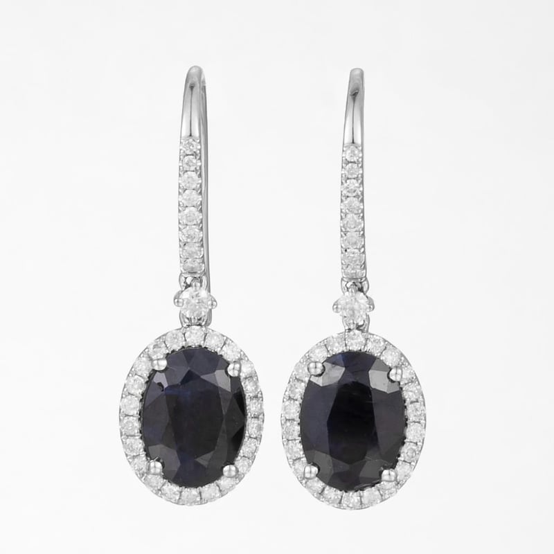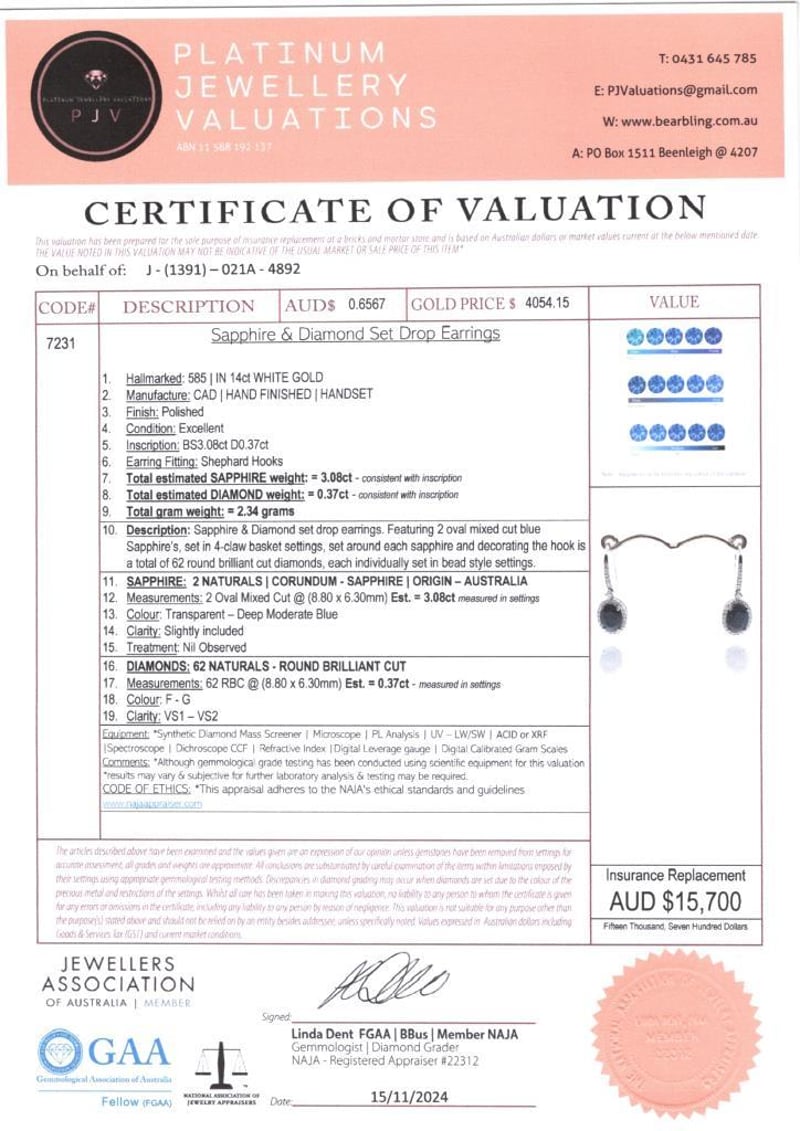 14CT WHITE GOLD SAPPHIRE AND DIAMOND DROP EARRINGS Featuring Centre, 2 Oval Mixed Cut, Deep Moderate Blue Australian Sapphires (3.08Ct Tsw, Slightly Included), Claw Set, With 62 Round Brilliant Cut Diamonds (0.37Ct Tdw, F-G Colour, Vs1-Vs2 Clarity), Bead Set. Valuations Provided by an Independent Third-Party Professional Not Directly Associated With Lloyds Auctions at AUD $15700This valuation has been conducted by an independent third-party professional. The valuation amount is an assessment by the issuing valuer and does not reflect the auction value of the item. Any inquiries regarding the valuation should be directed to the issuing valuer (refer to contact details on the certificate), as Lloyds Auctions has no affiliation or influence over the valuation, the valuer, or the stated amount. Condition: Good - Refer Images 0586374+1776