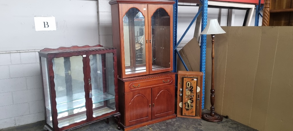Furniture, assorted furniture includes large Display cabinet, small display cabinet, floor lamp and moreDimensions largest 190cm H x 95cm W x 40cm DSold as lot