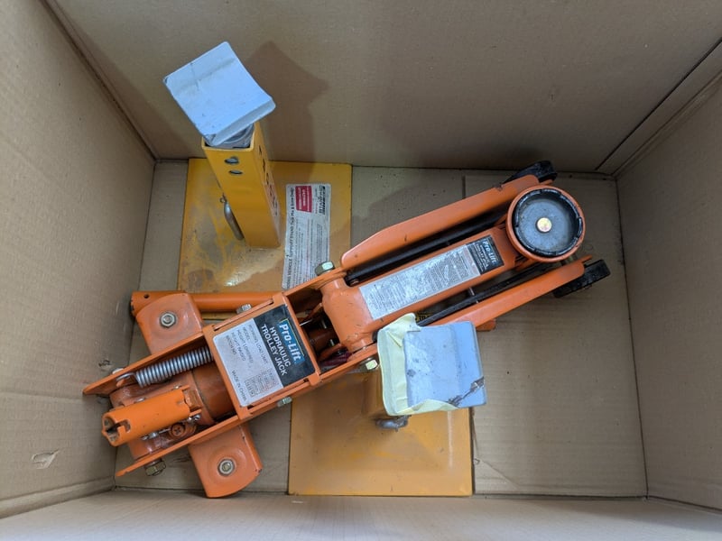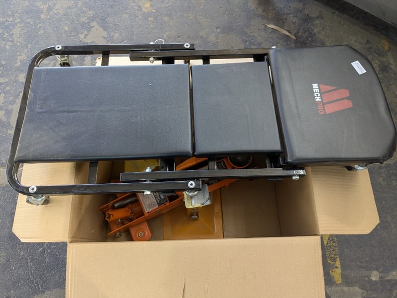 Tools, including hydraulic trolley jack, vehicle support stands and mechanic dolly Sold as lot