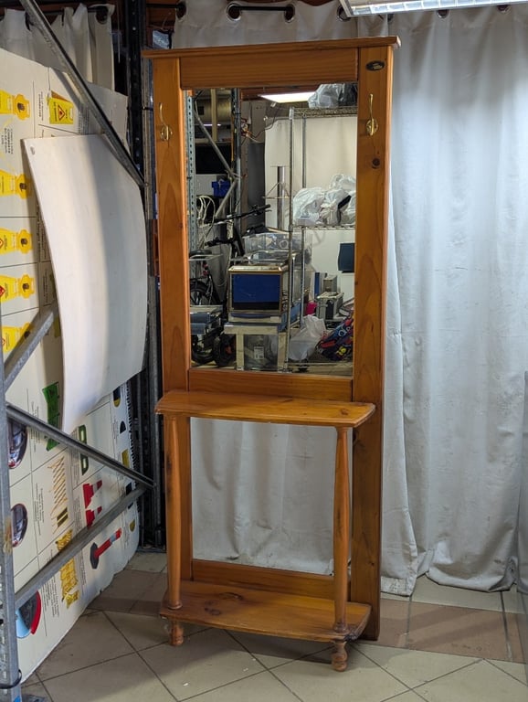 Hall stand with mirror and hooks, timberNote: general wear and tear Dimensions: H 184cm x W 72cm x D 28cm