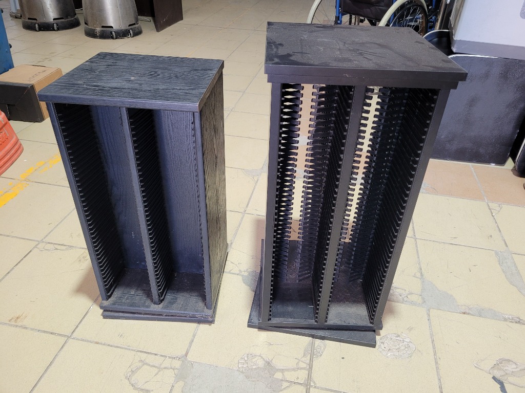 2 x CD Storage Tower, Designed to hold & Organise CDs & DVDs or Video Games, Rotatable, Black Timber FinishDimensions Small H:64cm W:29cm D:31cmDimensions Big H:73cm W:35cm D:35cmSOLD AS LOT