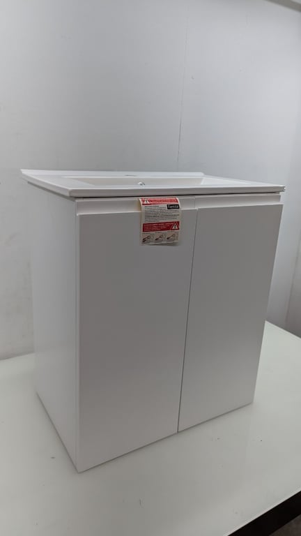 600mm Vanity Cabinet, Firenza, Model: 60DF-C, Colour: Satin White, With Skinny Ceramic Top, Firenza, Model: Delgado 600, Colour White, 1 × Tap Hole, Dimensions Cab: 65cm(H)×58cm(W)×37cm(D), Top: 61cm(W)×37cm(D) Sold As Lot