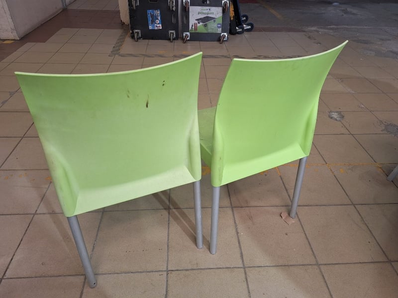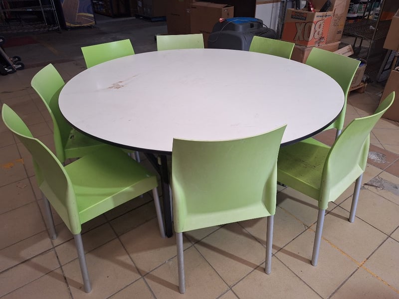 Event 8-Seater Table & Chairs, Timber & Plastic Style, White & Green FinishDimensions Table H:75cm W:165cm D:165cmDimensions Chair H:84cm W:45cm D:45cmSOLD AS LOT