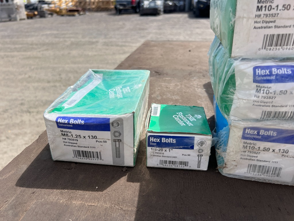 Crate of Assorted BoltsNew In Box1 x M8-1.25 x 150 Hex Bolts1 x M10-1.50 x 60 Hex Bolts1 x M6-1.00 x 150 Hex Bolts1 x M12-1.75x 220 Hex Bolts3 x M8-1.25 x 50 Hex Bolts 1 x M10-1.50 x 150 Hex Bolts3 x M10-1.50 x 130 Hex Bolts1 x M8-1.25 X 130 Hex Bolts1 x 1/4-20 x 1 Hex BoltsSOLD AS ISLocation: #MACKAYContact Kyle Haywood | Ph 0487 020 888 | [email protected]Holding Yard 3/263 Connors Road, Paget , MACKAY QLD, Australia