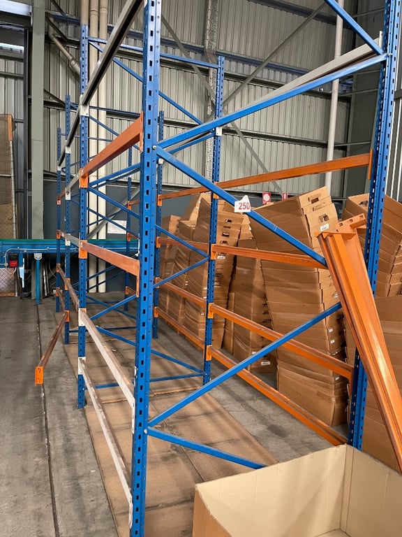 Industrial Racks, 4 sections, 5 cross piece, 2 upright APPROX DIMENTIONS H 300cm W 120cm D 565cm BID PER SECTIONS, MUST TAKE 4 SECTIONS