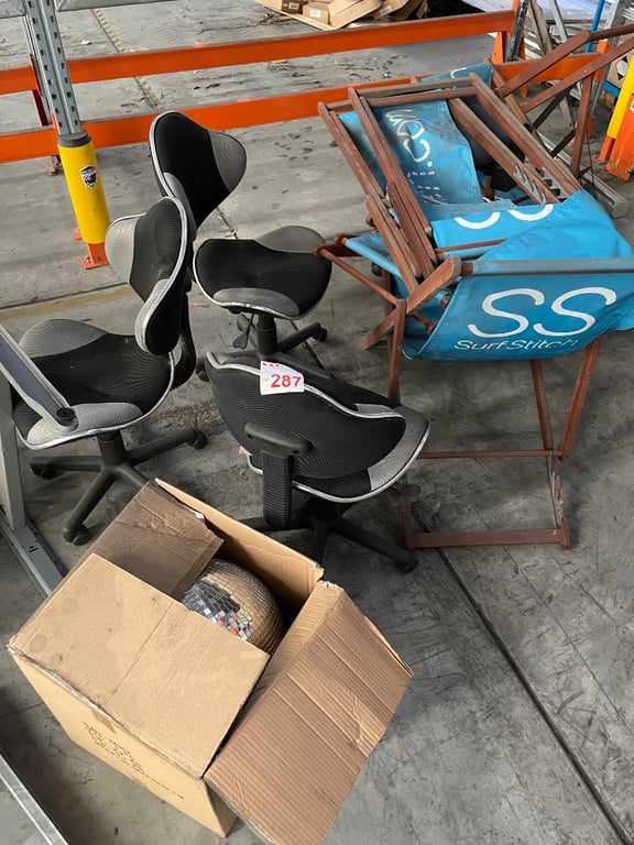 Assorted Lot, office chair, disco ball and fold out beach chairs SOLD AS LOT
