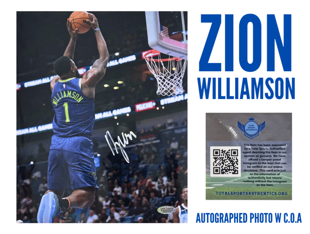 ZION WILLIAMSON AUTOGRAPHED PHOTO — CERTIFIED BY TOTAL SPORTS AUTHENTICS!Own A Signed Photo Of One Of Basketball’S Most Explosive Young Stars — Zion Williamson. This 8X10 Action Shot Captures Zion Mid-Air For A Signature Dunk In His New Orleans Pelicans Uniform. Authenticated By Total Sports Authentics, This Hand-Signed Piece Includes A Matching Qr-Coded Coa. A Perfect Collector’S Piece For Pelicans Fans Or Nba Rising Star Collectors.-Hand-Signed 8X10 Photo Of Zion Williamson-Certified Authentic By Total Sports Authentics-High-Flying Action Shot In Pelicans JerseyDisclaimer: Please Carefully Review All Images Provided To Judge Condition For Yourself. Minor Imperfections May Exist On Surface Or Corners.Condition: Good - Refer To Images584863+1