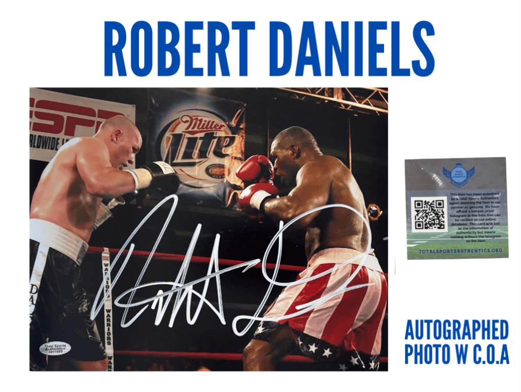 ROBERT DANIELS AUTOGRAPHED 8X10 BOXING PHOTO — CERTIFIED & AUTHENTICATED WITH COA! Capture A Piece Of Boxing History With This Striking 8X10 Photo Signed By Former Wba Cruiserweight Champion Robert Daniels. Known For His Powerful Style And Championship Pedigree, This Signed Photograph Shows Daniels In Action In The Ring. Comes Authenticated With A Certificate Of Authenticity (Coa) From Total Sports Authentic, Ensuring Legitimacy. A Top-Tier Collectible For Fans Of Vintage Boxing Or Combat Sports Memorabilia. -8X10 Signed Photo Of Robert Daniels In-Ring -Comes With Total Sports Authentic Coa -Perfect For Boxing Collectors And Sports Fans Condition: Good - Refer To Images 584863+4