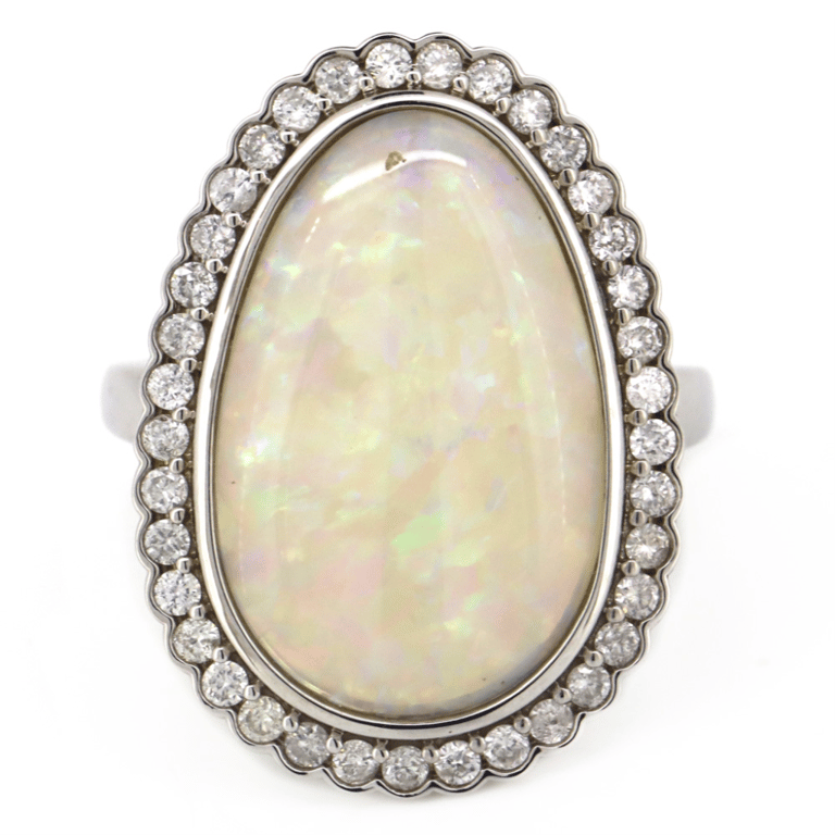 14K WHITE GOLD, 5.24CT AUSTRALIAN COOBER PEDY OPAL AND DIAMOND, HALO RING.