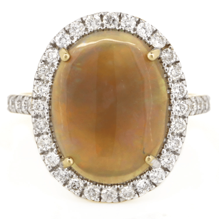 14K YELLOW GOLD, 3.05CT AUSTRALIAN LIGHTNING RIDGE OPAL AND DIAMOND, HALO RING. The Centre Features, One Oval Cabochon Cut, Beige With Red Low Flash-Colour, Australian Lightning Ridge Opal (3.05Ct, Moderate Inclusions), Claw Set. Decorating The Setting And Band Are, 38 Round Brilliant Cut, Diamonds (0.53Ct Tdw, G-H Colour, Si1-Si2 Clarity), Bead Set. Ring Size N. Valuations Provided by an Independent Third-Party Professional Not Directly Associated With Lloyds Auctions at AUD $$26,000.00This valuation has been conducted by an independent third-party professional. The valuation amount is an assessment by the issuing valuer and does not reflect the auction value of the item. Any inquiries regarding the valuation should be directed to the issuing valuer (refer to contact details on the certificate), as Lloyds Auctions has no affiliation or influence over the valuation, the valuer, or the stated amount. Condition: Good - Refer Images 0645830+8010