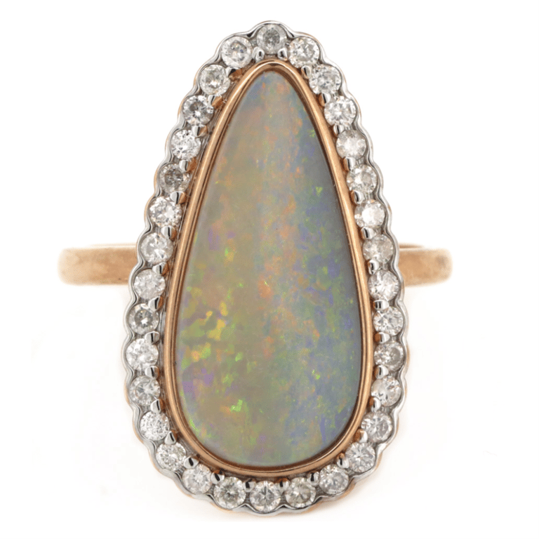 The Centre Features, One Pear Cabochon Cut, Grey, Australian Lightning Ridge Opal (1.99Ct, Flashes Of Shades Green Of Blue, Orange, Purple And Yellow), Bezel Set. Surrounding The Centre In A Halo Are, 32 Round Brilliant Cut, Diamonds (1.99Ct Tdw, H-K Colour, P2+ Clarity), Micro-Pip-Claw Set. Ring Size M 1/2.