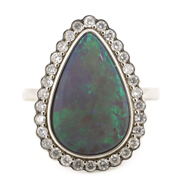 The Centre Features, One Pear Cabochon Cut, Australian Lightning Ridge Opal (2.86Ct, Green, Violet, Yellow, Blue, Pink Strong Colour Play), Bezel Set. Surrounding The Centre In A Halo Are, 30 Round Brilliant Cut, Diamonds (0.44Ct Tdw, J-K Colour, Si1-Si2 Clarity), Semi-Bezel/Bead Set. Ring Size L 1/2.