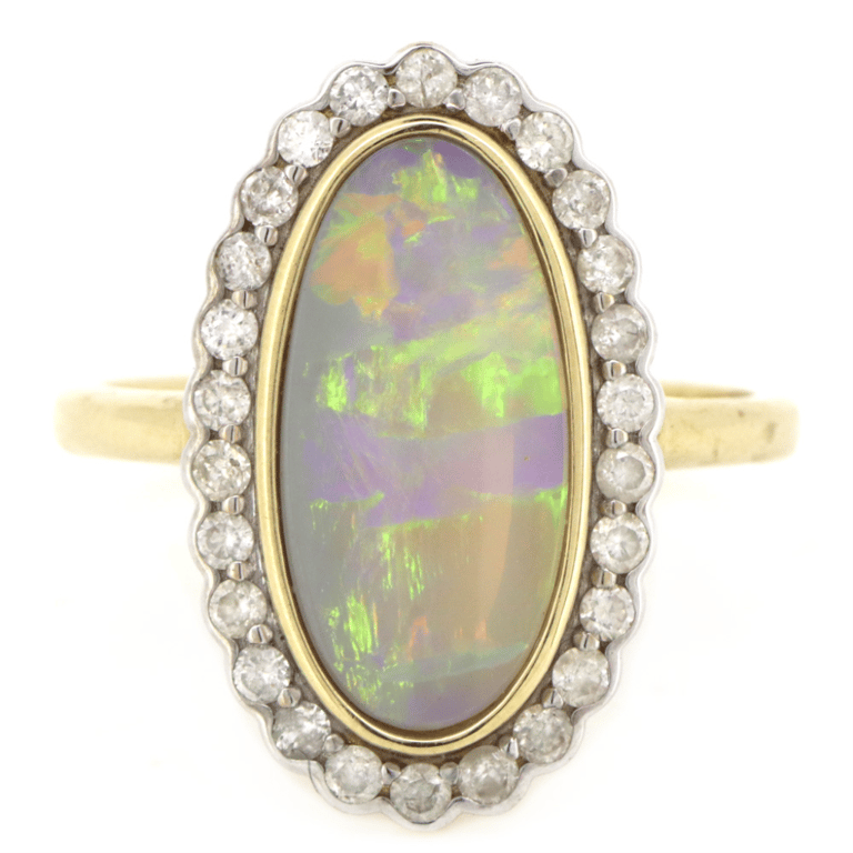 The Centre Features, One Oval Cabochon Cut, Australian Lightning Ridge Opal (1.55Ct, Green, Violet, Yellow, Blue, Pink Strong Colour Play), Bezel Set. Surrounding The Centre In A Halo Are, 26 Round Brilliant Cut, Diamonds (0.40Ct Tdw, J-K Colour, Si1-Si2 Clarity), Semi-Bezel/Bead Set In White Gold. Ring Size M.