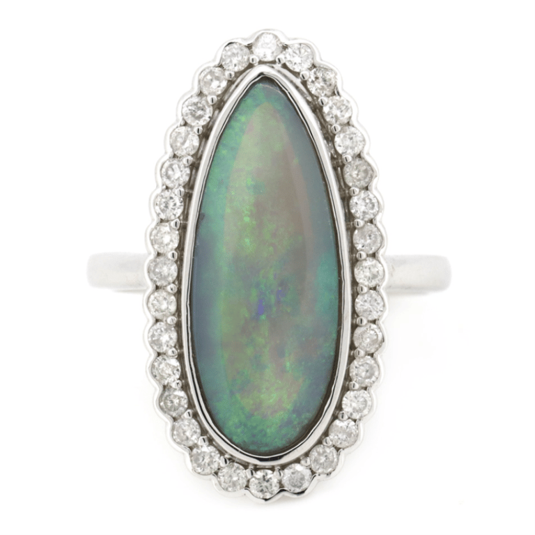 14K WHITE GOLD, 2.61CT AUSTRALIAN LIGHTNING RIDGE OPAL AND DIAMOND, HALO RING. The Centre Features, One Pear Cabochon Cut, Australian Lightning Ridge (2.61Ct, Green, Violet, Yellow, Blue And Pink Strong Colour Play), Bezel Set. Surrounding The Centre In A Halo Are, 32 Round Brilliant Cut, Diamonds (0.53Ct Tdw, J-K Colour, Si1-Si2 Clarity), Semi Bezel/Bead Set. Ring Size M. Valuations Provided by an Independent Third-Party Professional Not Directly Associated With Lloyds Auctions at AUD $$8,290.00This valuation has been conducted by an independent third-party professional. The valuation amount is an assessment by the issuing valuer and does not reflect the auction value of the item. Any inquiries regarding the valuation should be directed to the issuing valuer (refer to contact details on the certificate), as Lloyds Auctions has no affiliation or influence over the valuation, the valuer, or the stated amount. Condition: Good - Refer Images 0645830+8020