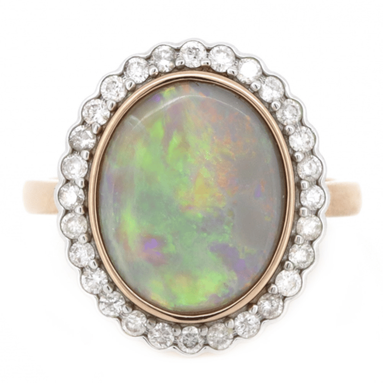 14K ROSE GOLD, 2.03CT AUSTRALIAN ANDAMOOKA OPAL AND DIAMOND, HALO RING. The Centre Features, One Oval Cabochon Cut, Solid Green, Australian Andamooka Opal (2.03Ct, Orange, Blue, Purple And Yellow Colour Play, Moderate Flash Pattern), Bezel Set. Surrounding The Centre In A Halo Are, 28 Round Brilliant Cut, Diamonds (0.39Ct Tdw, H-K Colour, P2+ Clarity), Bead Set. Ring Size L 1/2. Valuations Provided by an Independent Third-Party Professional Not Directly Associated With Lloyds Auctions at AUD $$15,900.00This valuation has been conducted by an independent third-party professional. The valuation amount is an assessment by the issuing valuer and does not reflect the auction value of the item. Any inquiries regarding the valuation should be directed to the issuing valuer (refer to contact details on the certificate), as Lloyds Auctions has no affiliation or influence over the valuation, the valuer, or the stated amount. Condition: Good - Refer Images 0645830+8024