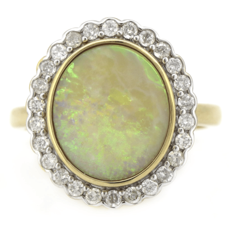14K YELLOW GOLD, 2.07CT AUSTRALIAN ANDAMOOKA OPAL AND DIAMOND, HALO RING. The Centre Features, One Oval Cabochon Cut, Solid Yellow, Australian Andamooka Opal (2.07Ct, Orange, Green, Yellow And Violet Colour Play, Moderate Flash Pattern), Bezel Set. Surrounding The Centre In A Halo Are, 26 Round Brilliant Cut, Diamonds (0.38Ct, H-K Colour, P2+ Clarity), Bead Set. Ring Size L 1/2. Valuations Provided by an Independent Third-Party Professional Not Directly Associated With Lloyds Auctions at AUD $$10,500.00This valuation has been conducted by an independent third-party professional. The valuation amount is an assessment by the issuing valuer and does not reflect the auction value of the item. Any inquiries regarding the valuation should be directed to the issuing valuer (refer to contact details on the certificate), as Lloyds Auctions has no affiliation or influence over the valuation, the valuer, or the stated amount. Condition: Good - Refer Images 0645830+8004