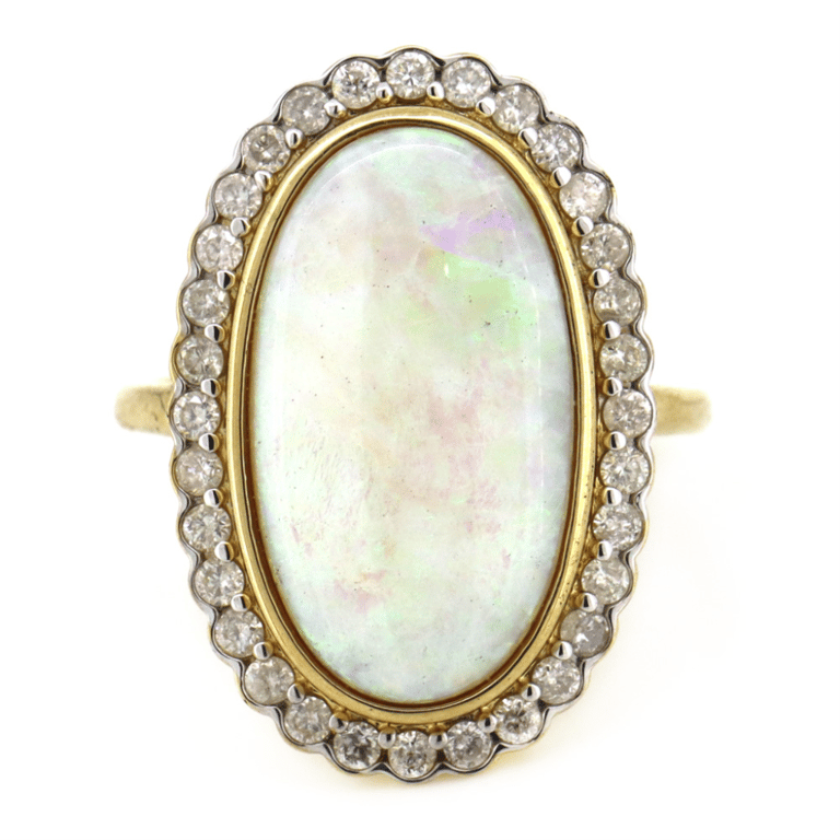 The Centre Features, One Oval Cabochon Cut, Solid White, Australian Coober Pedy Opal (5.18Ct, Orange, Blue, Purple, Yellow, Moderate Flash Pattern), Bezel Set. Surrounding The Centre In A Halo Are, 32 Round Brilliant Cut, Diamonds (0.37Ct Tdw, H-K Colour, P2+ Clarity), Bead Set. Ring Size M 1/2.