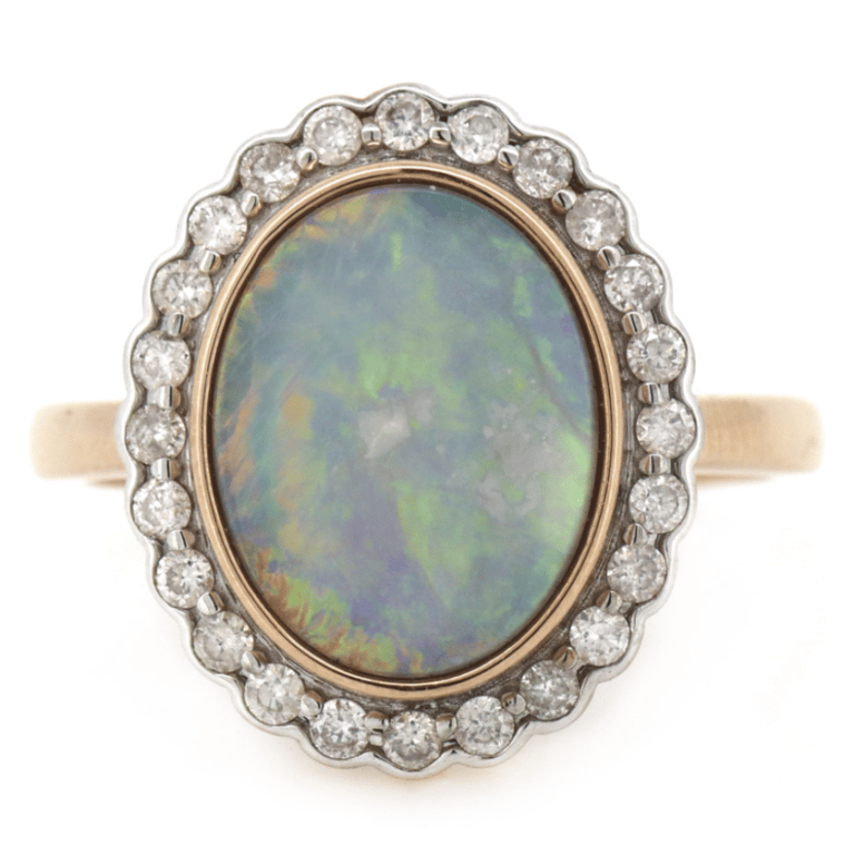 14K ROSE GOLD, 2.22CT AUSTRALIAN LIGHTNING RIDGE OPAL AND DIAMOND, HALO RING. The Centre Features, One Oval Cabochon, Green Base Colour, Australian Lighting Ridge Opal (2.22Ct, Flashes Of Orange, Shades Of Blue, Purple And Yellow, Slight-Moderate Inclusions), Bezel Set. Surrounding The Centre In A Halo Are, 24 Round Brilliant Cut, Diamonds (0.31Ct Tdw, H-K Colour, P2+ Clarity), Bead Set. Ring Size M 1/2. Valuations Provided by an Independent Third-Party Professional Not Directly Associated With Lloyds Auctions at AUD $$12,900.00This valuation has been conducted by an independent third-party professional. The valuation amount is an assessment by the issuing valuer and does not reflect the auction value of the item. Any inquiries regarding the valuation should be directed to the issuing valuer (refer to contact details on the certificate), as Lloyds Auctions has no affiliation or influence over the valuation, the valuer, or the stated amount. Condition: Good - Refer Images 0645830+8007